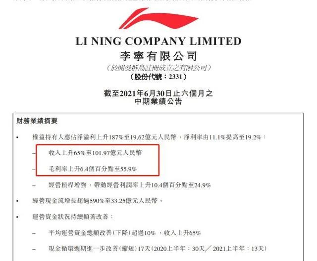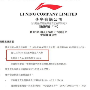 上周五,李宁发布2021年中期业绩公告。财报显示,上半年营收101.97亿元人民币,同比增长65%;归母净利润为19.62亿元,同比增长187%;经营现金流增长超过590%;整体毛利率更是从去年的49.5%增长至55.9%。