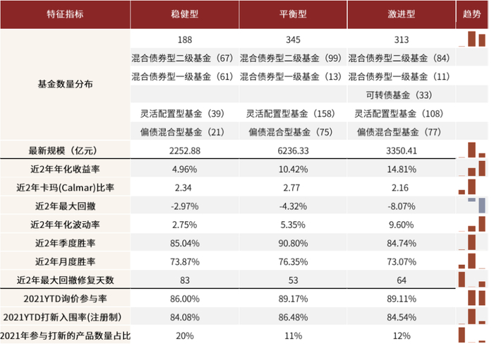 图表:不同风险偏好“固收+”基金分布及业绩相关指标