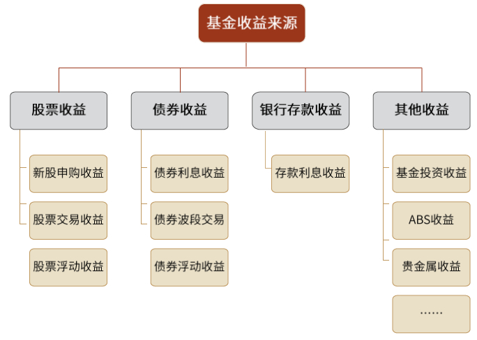 按照资产类别可以将基金的收益来源划分为股票收益、债券收益、银行存款收益和其他收益。