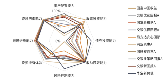 投资能力刻画及业绩评价体系构建:“固收+”基金投资涉及多资产和多策略,产品大多秉承绝对收益的管理理念,重视收益和风险平衡后的组合整体收益,我们基于定期报告资产配置比例、利润表、净值数据等信息从资产配置、股票投资能力、债券投资能力、收益获取能力、风险控制能力、投资持有体验、顺境进攻能力及逆境防御能力指标加权得分综合衡量基金的投资管理能力。同时,结合询价参与率及打新入围率判断基金是否持续参与新股申购且准确率较高。从“固收+”基金整体的投资能力圈分布来看,综合能力得分较高的产品,在各个细分维度上的能力值相对比较均衡,至多有1~2项能力比较薄弱。