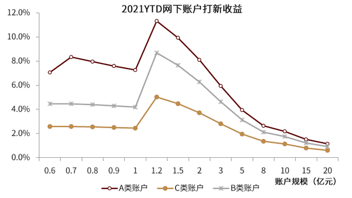 从今年以来的打新收益贡献来看,刚好符合沪深两市股票市值门槛1.2亿元的规模是最佳的,但“固收+”基金仅有部分仓位可投股票,因此,规模下限在2亿元(参与单市场、30%仓位)或5亿元左右(两市打新,25%左右仓位)是获取打新收益的最佳选择,当产品规模超过10亿元之后,可以看到打新对于产品的收益贡献已经较为稀薄,仅有2%左右。因此,在打新收益比较丰厚的阶段,同等股债管理能力下,基金规模的增长会一定程度影响组合整体收益。