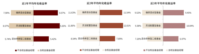 “固收+”基金发展的大年,不少基金公司推出股债双基金经理的管理模式,通过权益、债券分工协作共同管理。我们统计了存续的“固收+”基金中,现任基金经理含权益背景基金经理的数量占比,灵活配置型和偏债混合型较高,均接近40%,其他品类相对较少。以对照组的形式,分别计算各类型“固收+”基金含权益背景基金经理和不含权益背景基金经理在近1~3年管理业绩的差异,我们发现:1)加入权益基金经理,总体上并未提升基金业绩,甚至不含权益基金经理的产品组整体业绩更优;2)股债双基金经理搭配是近几年刚刚兴起,是否能实现1+1>2的效果与公司本身的考核机制及基金经理之前的配合默契密不可分。