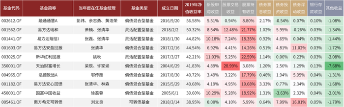 图表:2019年收益率前十的“固收+”基金收益来源分解