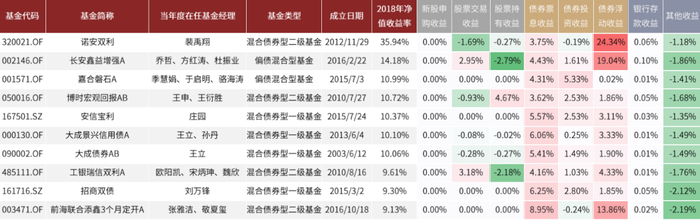 图表:2018年收益率前十的“固收+”基金收益来源分解