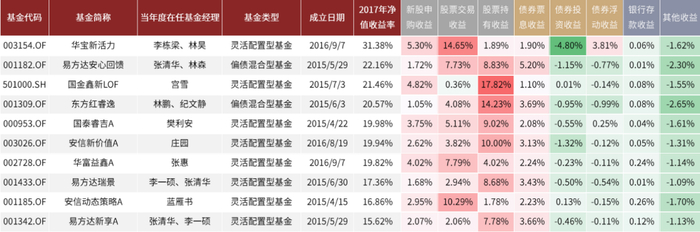 2016年业绩领先的“固收+”基金中灵活配置型产品较多,但仔细观察可以发现,业绩领先的这些产品通过利润表拆分测算的合计收益率与净值收益率差距较大,主要的原因是基金在年度内经历了较为明显的规模变化,通过低频的数据估计基金规模误差较大,因此基于利润表进行收益分解的参考价值也相对较低。总的来看,2016年网下打新对于表现优异的“固收+”产品贡献并不明显,年度业绩表现异常突出的光大鑫欣A和光大睿鑫A均是由于短期内资金赎回,缴纳大额的赎回费计入了资产净值导致的净值跳升。