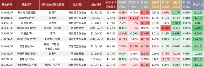 图表:2020年收益率前十的“固收+”基金收益来源分解