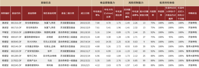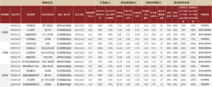3)打新策略“固收+”基金:打新积极性高、命中率突出、综合能力强。打新基金是制度红利下诞生的一类较为特殊的产品,有一定的阶段性和不可持续性,我们依次通过打新能力(打新参与率和打新入围率均高于90%)、合适规模区间(2-10亿元)锁定初步的打新基金池,进而再通过综合投资能力得分筛选各风险偏好中较为突出的产品。