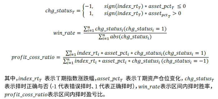 “固收+”基金投资涉及多资产和多策略,在投资能力刻画时首先考虑到的便是资产配置能力,资产配置能力也在各类基金经理调研和访谈中被认为是“固收+”产品是否能够做好的关键性因素。我们主要通过综合评估基金在股票、转债、纯债资产的择时胜率和盈亏比来衡量基金的资产配置能力。