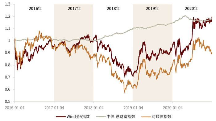 图表:2016年至2020年万得全A指数与中债总财富指数净值走势