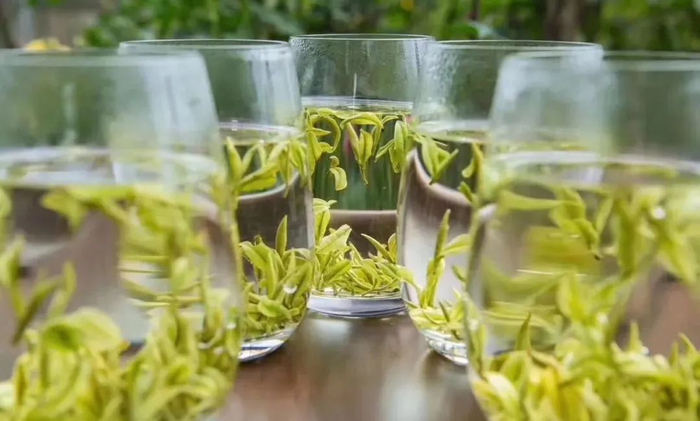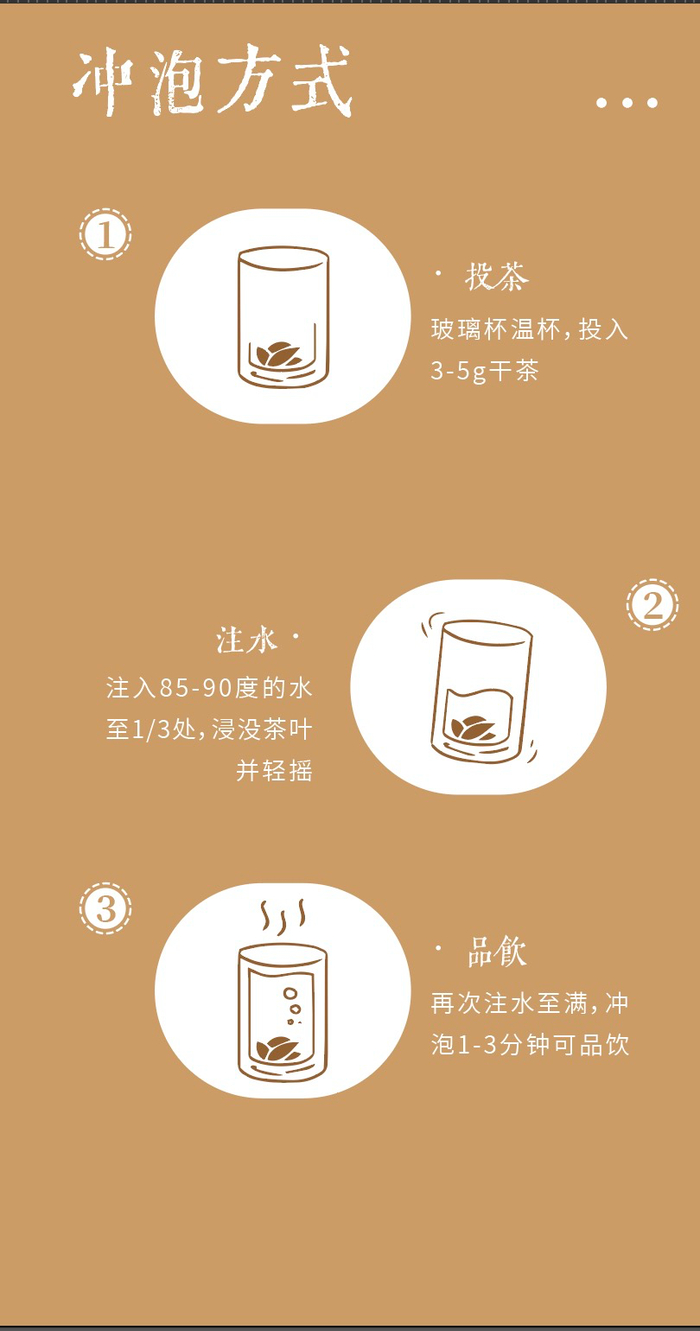 以85℃-90℃山泉水冲泡为佳,浸没茶叶并轻摇,再次注水至满,观白茶舒展,还原玉色。通过玻璃杯可以尽情地欣赏安吉白茶在水中的千姿百态。