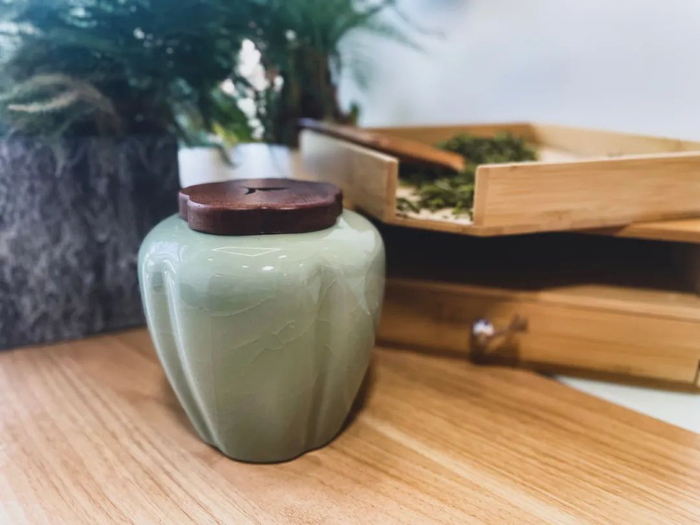 茶叶罐为陶瓷材质,一罐包含精品安吉白茶100g。密封性好易储存,不易受潮。