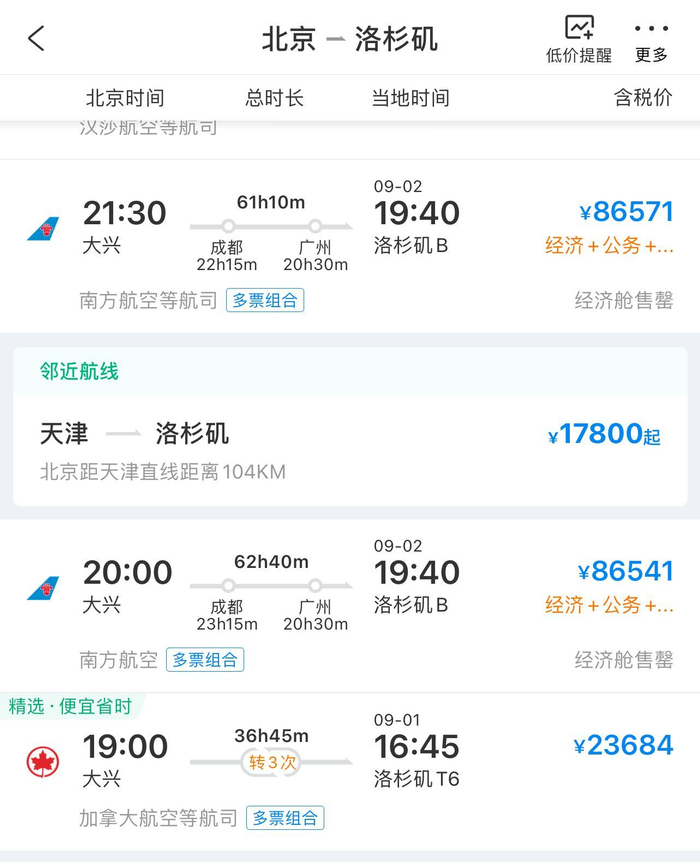 其余航空公司的线路均需中转两个以上的城市,中转时间在35小时至60小时左右。以南航大兴-洛杉矶8月31日航班为例,经济舱已经售罄,在经济舱+公务舱+头等舱多票组合下,票价达到86571元。