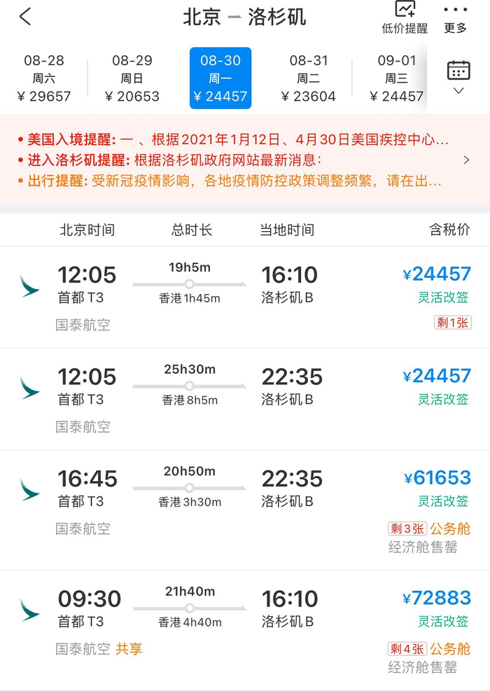 界面新闻记者在携程搜索发现,未来半个月内,北京-洛杉矶航线几乎没有直飞航班可供选择。国泰航空承运航班耗时相对较短,仅需中转一次,但中转时间也长达20小时以上,仍然被热抢。8月30日国泰航空首都-洛杉矶航班经济舱票价为24457元,部分航班经济舱售罄,公务舱仅余4张机票,价格高达72883元。