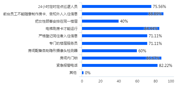 在酒店的一系列监管措施中,消费者认为,“前台员工不能随意制作房卡”“房间内设置内门锁”“电梯刷卡运行”“一键报警电话”等措施尤为重要,是能够让顾客在入住过程中感到安全舒心的要素。