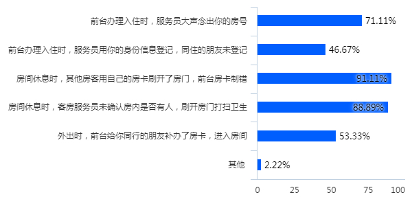 在酒店的一些服务行为中,消费者认为“酒店前台Double check-in” “客房服务员未经允许进入房间”极其容易侵犯个人隐私。众所周知,这两种行为在酒店行业频繁发生,需要引起酒店管理者重视。