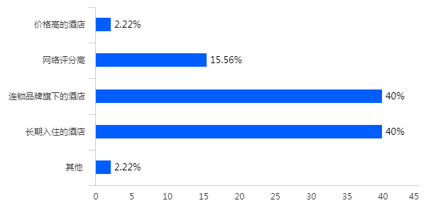 从个人安全的角度出发,40%的被调查者表示“连锁品牌旗下的酒店” “长期入住的酒店”值得信赖,15.56%的被调查者认为“网络评分高”的酒店值得信任。