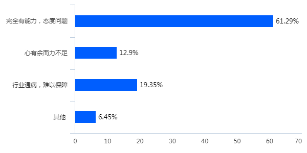 首先,在“酒店行业是否具备保障客人人身安全、隐私的能力”上, 61.29%的酒店员工表示完全有能力监管,只是态度和监管力度存在问题;其次,19.35%的酒店员工认为酒店安全问题是行业通病、难以保障;12.9%的酒店员工认为在这个事情上,酒店通常心有余而力不足。
