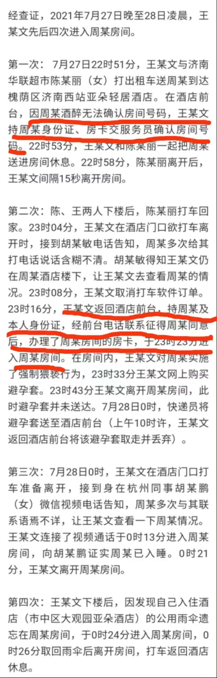 第三、四次:王某在拿到房卡后,曾多次进出周某房间。在这个过程中,王某是否曾经归还前台房卡并再次办理?或者,一直持有周某房卡,并未归还前台。