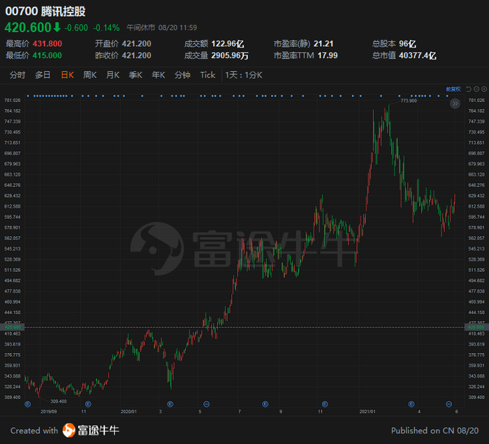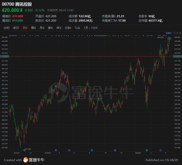 回购计划结束后,伴随全球经济复苏及腾讯业绩飞速增长,股价也开始一路上扬。2018年10月至2019年4月,腾讯股价累计涨幅逾20%,甚至一度接近400港元大关。
