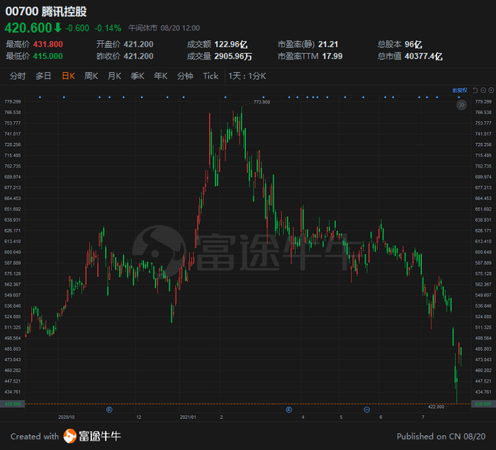 近段时间,腾讯股价近乎腰斩,从高点的773.4港元下跌至420港元附近,跌幅超过了45%,市盈率也已跌至17倍,位于历史低点。面对大幅回撤,腾讯在8月19日(本周四)回购18万股公司股份,涉及资金7696.5万元,每股回购价介于419.4至435.2元。
