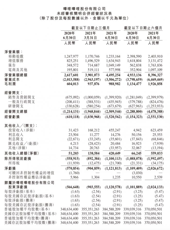 8月19日晚,B站发布了截至6月30日的2021年第二季度财报。财报显示,当期,其营收为44.953亿元,与上年同期相比增长72%;净亏损为11.218亿元,而上年同期净亏损为人民币5.709亿元。不按照美国通用会计准则,调整后的净亏损为8.578亿元,而上年同期调整后的净亏损为人民币4.757亿元。