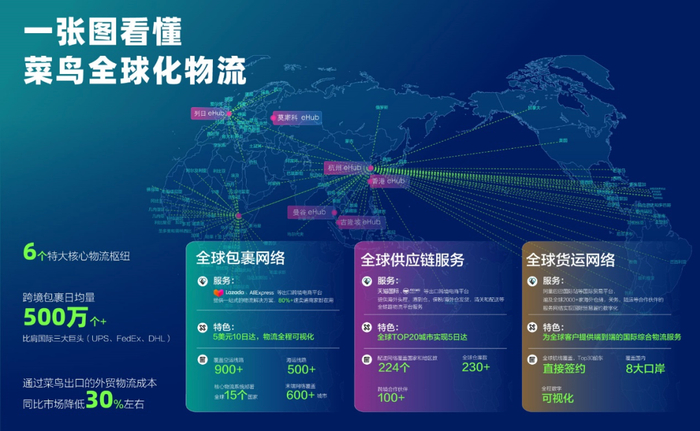 目前,菜鸟全球物流网络涵盖6个特大核心物流枢纽,业务覆盖6大洲174个国家和地区,921个城市/港口,运营超千条空运、海运专线,每月仅航空货机使用超过200架次。到2021年3月,菜鸟日均承运跨境包裹量已达500万单,与全球三大快递巨头FedEx、DHL、UPS在同一梯队,成为全球新四大跨境包裹网络之一。