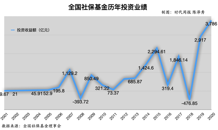 8月18日,全国社会保障基金理事会发布的《2020年全国社会保障基金理事会社保基金年度报告》(以下简称“年报”)显示,2020年社保基金投资收益额3786.6亿元,较2019年的2917亿元,多挣了869亿元。