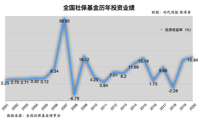 时代周报记者梳理发现,社保基金仅在2008年和2018年录得负收益,分别为-6.79%和-2.28%。其余的18年,均为正收益。