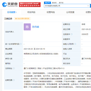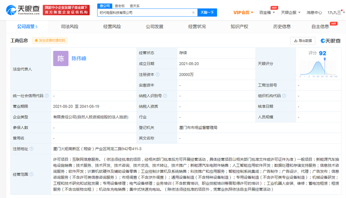 据天眼查APP显示,8月20日,时代电服科技有限公司成立,注册资本2亿,法定代表人为陈伟峰,经营范围包括新能源汽车换电设施销售;工业机器人安装、维修;蓄电池租赁;集中式快速充电站等。股东信息显示,该公司由宁德时代新能源科技股份有限公司全资持股。