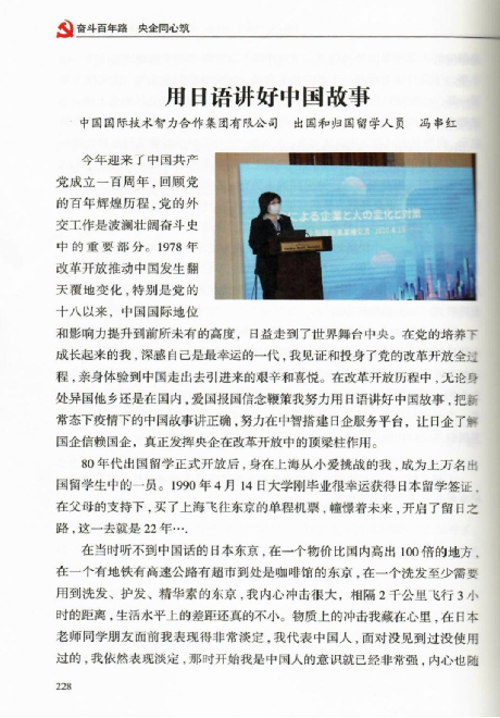 为隆重庆祝建党百年,国资委党委统战部于2021年3月印发《关于在中央企业广泛开展“庆百年、爱企业、献良策、做贡献”主题活动的通知》。经过层层严格评选,中智上海公司日企俱乐部智樱会负责人冯串红撰写的《用日语讲好中国故事》一文上榜,被收录进本次优秀征文汇编中。