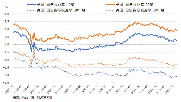 周内(8月11日至8月17日)美国长端国债收益率下降,其中美国10年期国债收益率与30年期国债收益率分别下降10bp和7bp;较年内高点分别下降48bp和53bp。周内美国10年期国债实际收益率下降3bp,30年期国债实际收益率上涨1bp。美国长端国债收益率持续走低的原因可能是投资者对未来经济增长的预期降低或者对于通胀的担忧消退,前者可能是德尔塔变异病毒的蔓延所致,而后者可能是受美联储提前加息的预期与增长放缓的CPI数据影响。