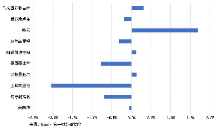 从年内来看,人民币兑多数主要新兴市场货币升值。其中,人民币兑土耳其里拉的年内升值最高,为13.98%;兑泰国铢和韩元年内升值分别为11.50%和7.78%。人民币仅兑俄罗斯卢布和墨西哥比索贬值,分别为2.10%和0.31%。