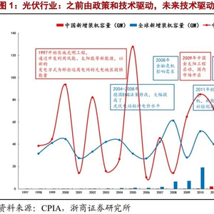 光伏行业:由政策+技术驱动,行业发展犹如“长江后浪推前浪”,伴随每一代技术进步,中国出现了尚德、英利、协鑫、隆基、通威等一批又一批的光伏行业龙头。