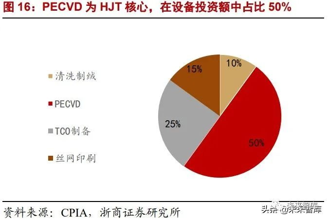 HJT 4 大工艺步骤:制绒清洗、非晶硅薄膜沉积、TCO 制备、电极制备,对应的设备 分别为清洗制绒设备、PECVD 设备、PVD/RPD 设备、丝网印刷设备,在设备投资额占 比分别约 10%、50%、25%和 15%。