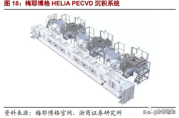2) PECVD(非晶硅薄膜沉积):该步骤取代了传统 PERC 工艺中的扩散工艺,是构造异 质结结构的关键,难度、壁垒最高,价值占到全部设备的 50%,为异质结设备的核 心。从技术路径上:板式 PECVD 是目前主流,管式 PECVD、Cat-CVD 具潜力。国外厂商 包括:梅耶博格(已不对外提供)、应用材料等。国内厂商包括:迈为股份、金辰 股份、捷佳伟创、理想能源、钧石能源等。