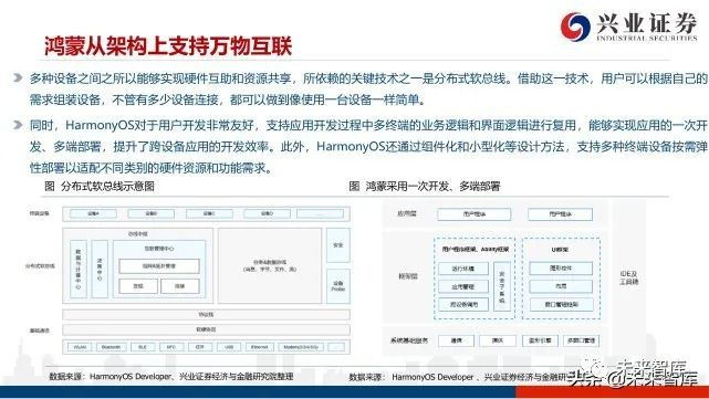 多种设备之间之所以能够实现硬件互助和资源共享,所依赖的关键技术之一是分布式软总线。借助这一技术,用户可以根据自己的 需求组装设备,不管有多少设备连接,都可以做到像使用一台设备一样简单。同时,HarmonyOS对于用户开发非常友好,支持应用开发过程中多终端的业务逻辑和界面逻辑进行复用,能够实现应用的一次开 发、多端部署,提升了跨设备应用的开发效率。此外,HarmonyOS还通过组件化和小型化等设计方法,支持多种终端设备按需弹 性部署以适配不同类别的硬件资源和功能需求。