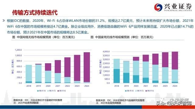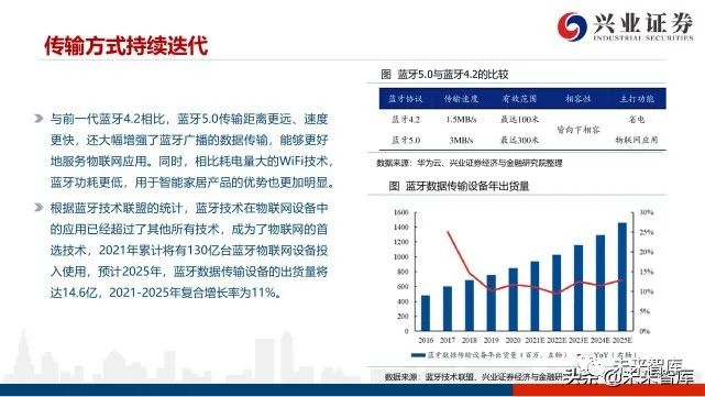 短距离通信是物联网未来主要的连接方式,包括Wi-Fi、蓝牙技术、Zigbee、RFID、NFC、LiF和WiFiHaLow。在短距离通 信中,WiFi和蓝牙具有传输距离广、速度快、成本低的优势,是目前IoT市场的首选方案。