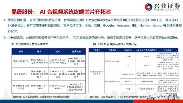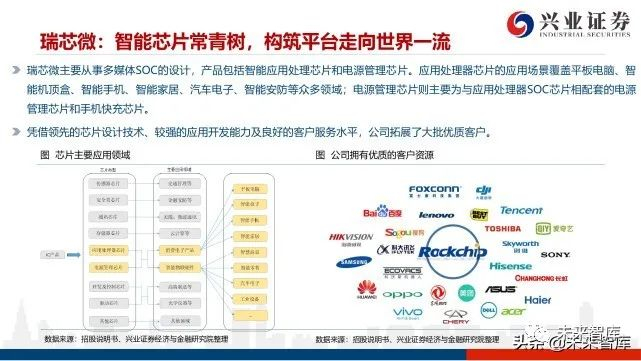 瑞芯微主要从事多媒体SOC的设计,产品包括智能应用处理芯片和电源管理芯片。应用处理器芯片的应用场景覆盖平板电脑、智 能机顶盒、智能手机、智能家居、汽车电子、智能安防等众多领域;电源管理芯片则主要为与应用处理器SOC芯片相配套的电源 管理芯片和手机快充芯片。凭借领先的芯片设计技术、较强的应用开发能力及良好的客户服务水平,公司拓展了大批优质客户。公司长期专注于智能应用、电源管理等芯片设计,从2014年开始公司向物联网和智能平台转型,推出了多款平台型产品如3288、 3399和3268等,具备很强的持续升级能力。此外,公司也推出了一系列新一代方案,从28nm升级到14nm、8nm等先进制程,性能实现25%提升的同时功耗降低35-40%, 成为国内领先的方案,为未来3年成长奠定了基础。