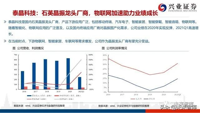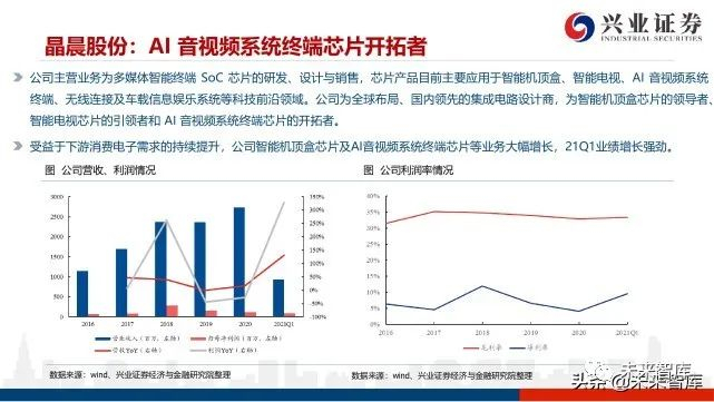 恒玄科技主营业务为智能音频 SoC 芯片的研发、设计与销售,芯片目前主要应用于耳机及智能音箱等低功耗智能音频终端,在智 能音频SoC芯片行业处于领先地位。受益于疫情后的需求反弹,公司2020年和2021Q1的业绩均十分亮眼,2021Q1营收YoY达124.55%,归母净利润YoY达4751.05%公司的智能音频SOC芯片在各终端品牌运用广泛,例如2020年推出的BES2500芯片,支持蓝牙V5.2,内置MCU主频高达300MHz, 未来能够支持 LE Audio-LC3 技术,可在相同速率下提供更高的声音质量,已经在荣耀、华为、OPPO等品牌中陆续出货。目前,公司的产品应用领域不断拓展,三条产品线为TWS、智能手表和智能音箱。随着AIoT的不断渗透,未来还将赋能更多形态 的智能设备,例如智能眼镜和智能家电等。