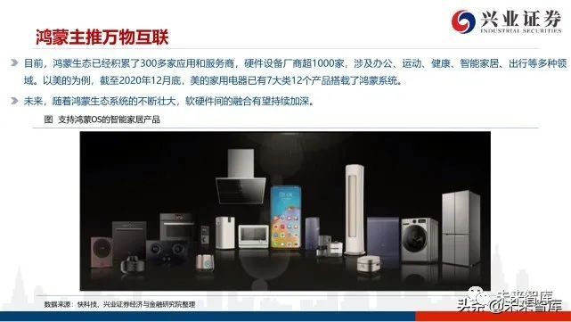 目前,鸿蒙生态已经积累了300多家应用和服务商,硬件设备厂商超1000家,涉及办公、运动、健康、智能家居、出行等多种领 域。以美的为例,截至2020年12月底,美的家用电器已有7大类12个产品搭载了鸿蒙系统。未来,随着鸿蒙生态系统的不断壮大,软硬件间的融合有望持续加深。