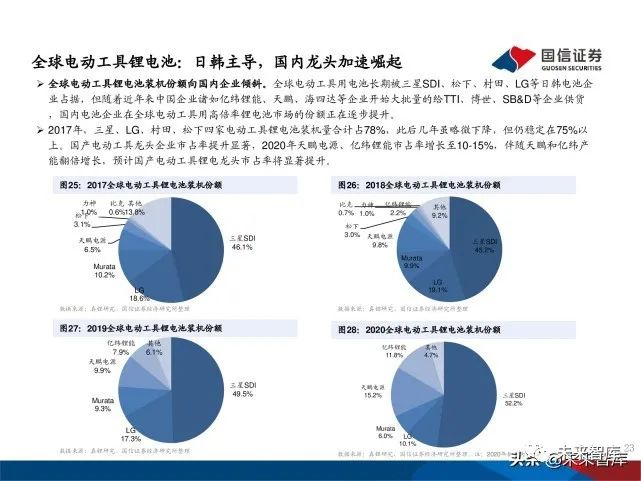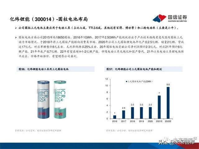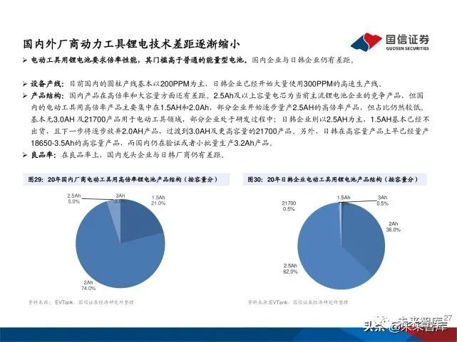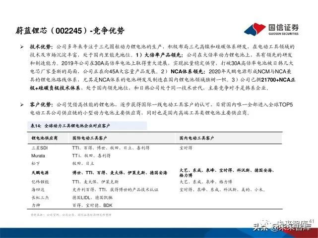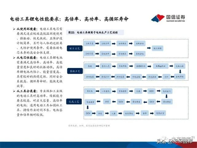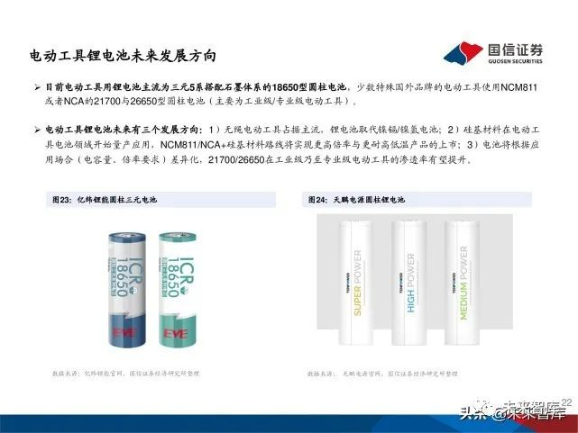 电动工具龙头企业也加大力度在中国寻找电池供应商。基于国内 电芯厂在高倍率圆柱型电芯领域的进展加快,在性能、规模、成 本等综合优势加持下,电动工具巨头对于电芯供应链的选择已经 明显转向中国。