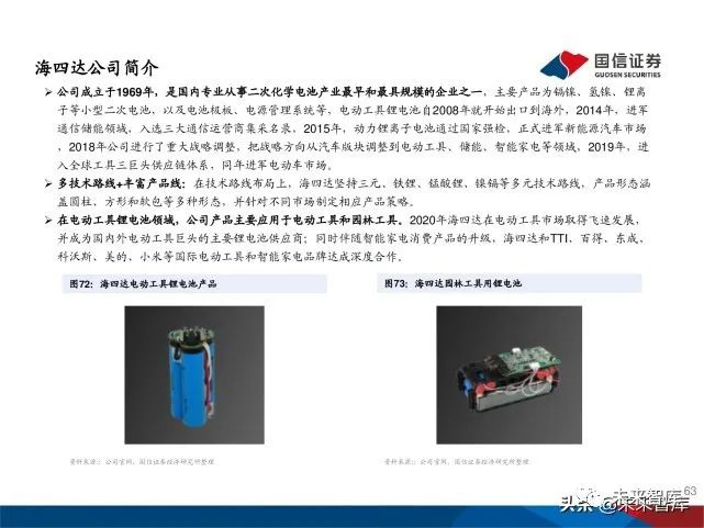 近两年中国头部电池企业无绳化电动工具龙头布局成果显著:天 鹏电源已进入全球TOP5电动工具公司供应链;亿纬锂能、海四 达已开始为TTI供货,鹏辉能源也通过TTI技术审核;力神电池给 百得、宝时德、BDK等供货。海四达还同时获得了博世的产品技 术认证。