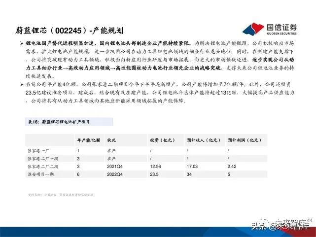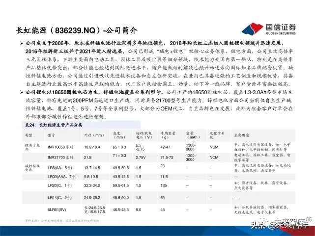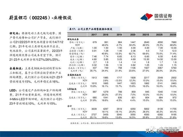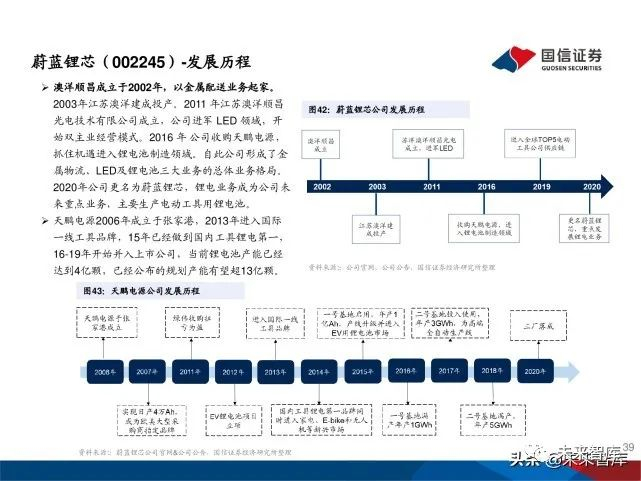 澳洋顺昌成立于2002年,以金属配送业务起家。 2003年江苏澳洋建成投产。2011 年江苏澳洋顺昌 光电技术有限公司成立,公司进军 LED 领域,开 始双主业经营模式。2016 年 公司收购天鹏电源, 抓住机遇进入锂电池制造领域。自此公司形成了金 属物流、LED及锂电池三大业务的总体业务格局。2020年公司更名为蔚蓝锂芯,锂电业务成为公司未 来重点业务,主要生产电动工具用锂电池。