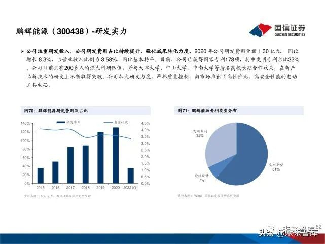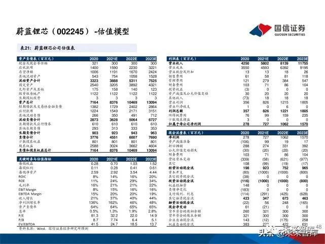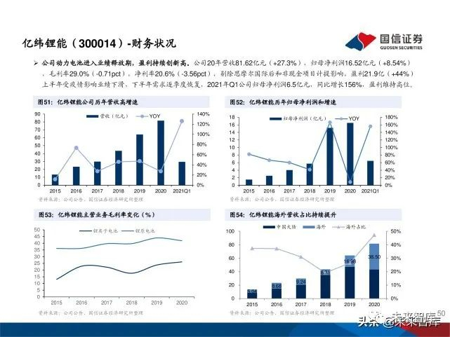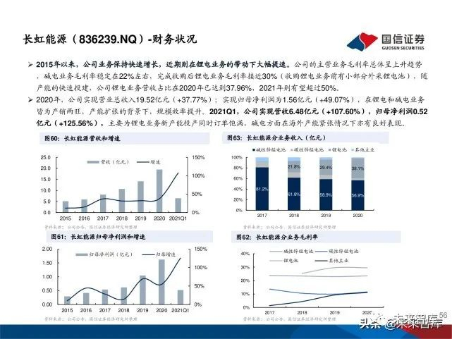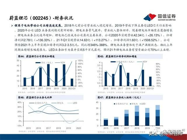 锂离子电池带动公司业绩高速发展。2018年之前公司营业收入稳定增长,2019年营收下降主要受LED芯片行业影响 。2020年公司 LED 业务盈利情况有所好转,锂电业务景气提升,营业收入整体回升,随着锂电池市场需求蓬勃增长 ,锂电池业务占比逐年增加,锂电池已经成为公司盈利主要来源。公司2020年实现营收42.34亿(+26.13%),归母 净利润2.78亿(+136.33%),21年Q1实现营收14.63亿(+113.27%),归母净利润1.60亿(+1508.52%)。公司 预告2021年上半年实现归母净利润3.2-3.5亿元,同比增346%-388%。锂电池业务整体处于满产满销状态,相比上年 同期业绩增长幅度很大,LED业务扭亏为盈并实现5千万元盈利。预计21年锂电池业务有望贡献公司70%以上业绩。