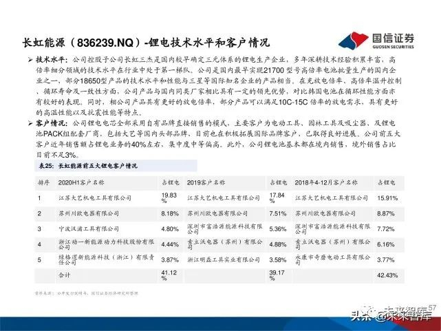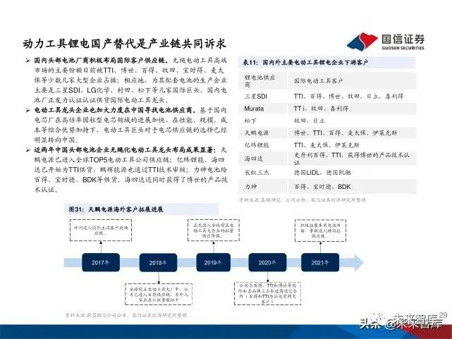国内头部电池厂商积极布局国际客户供应链。无绳电动工具高端 市场的主要份额目前被TTI、博世、百得、牧田、宝时得、麦太 保等少数几家大型企业占据;相应地,为其配套电池的生产企业 主要是三星SDI、LG化学、村田、松下等几家国际巨头,国内电 池厂正发力认证认证供货国际电动工具龙头。