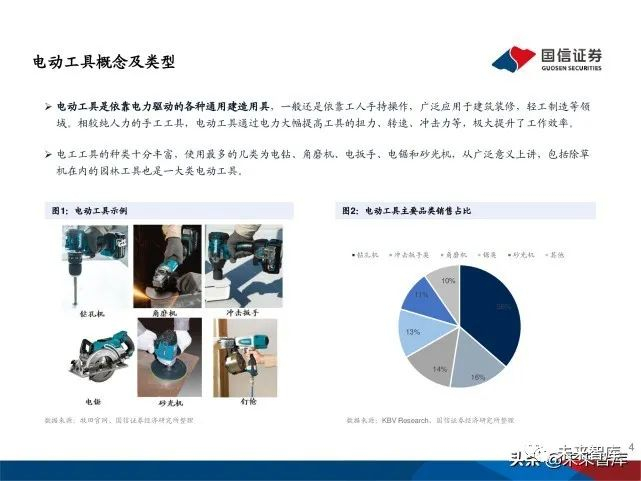 电动工具是依靠电力驱动的各种通用建造用具,一般还是依靠工人手持操作,广泛应用于建筑装修,轻工制造等领 域。相较纯人力的手工工具,电动工具通过电力大幅提高工具的扭力、转速、冲击力等,极大提升了工作效率。