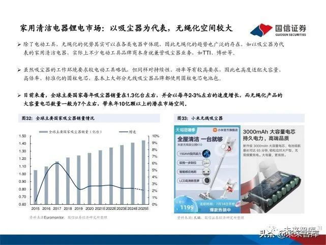 除了电动工具,无绳化的优势其实可以在各类电器中体现,因此无绳化的趋势也广泛的存在,如以吸尘器为代 表的家用清洁电器,实际上不少电动工具品牌商本身就兼营吸尘器业务,如TTI、博世等。虽然吸尘器的工作环境要求较电动工具略低,但同样对持续性、功率等有较高要求,因此也高度适配大容量、 高倍率、标准化的圆柱电芯,基本上大部分无线吸尘器品牌都使用圆柱电芯电池包。目前来看,全球主要国家每年吸尘器销量在1.3亿台左右,并会以每年2-3%左右的速度增长,而无绳化产品的 大容量电芯数量一般为7个左右,带来年10亿颗以上的潜在市场空间。