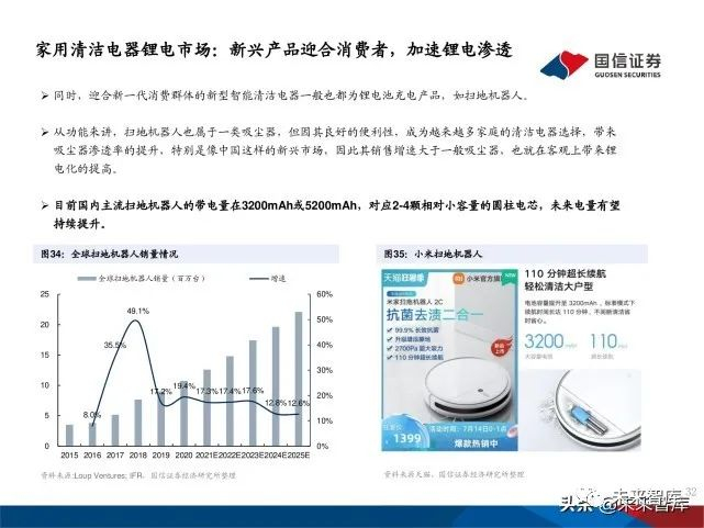 同时,迎合新一代消费群体的新型智能清洁电器一般也都为锂电池充电产品,如扫地机器人。从功能来讲,扫地机器人也属于一类吸尘器,但因其良好的便利性,成为越来越多家庭的清洁电器选择,带来 吸尘器渗透率的提升,特别是像中国这样的新兴市场,因此其销售增速大于一般吸尘器,也就在客观上带来锂 电化的提高。目前国内主流扫地机器人的带电量在3200mAh或5200mAh,对应2-4颗相对小容量的圆柱电芯,未来电量有望 持续提升。
