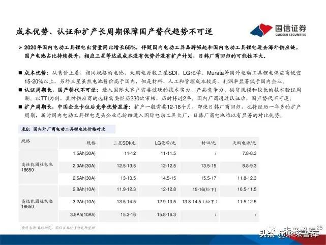 扩产周期长,中国企业卡位后竞争优势显著:扩产一般需要12-18个月,即使日韩厂商回归,也将经历一年多的扩产 周期,届时国内电动工具锂电龙头企业已纷纷进入国际电动工具大厂,日韩厂商电池难以有显著的对比优势。