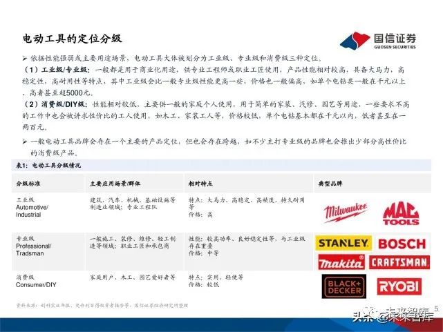 从市场细分来看,以专业级以上电动工具为主的商用用途占63.2%, 相对较大,而一般居民用途占比30.8%,这样的结构在较长时间里会 维持基本稳定。